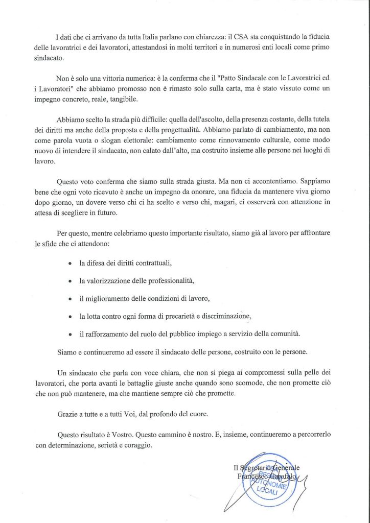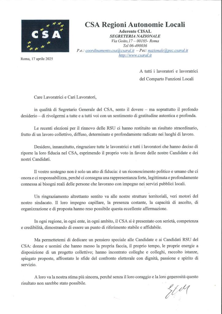 LETTERA DEL SEGRETARIO GENERALE FRANCESCO GAROFALO PER LE RSU Comunicato Stampa / Notizia / Volantino CSA 17 Aprile 2025